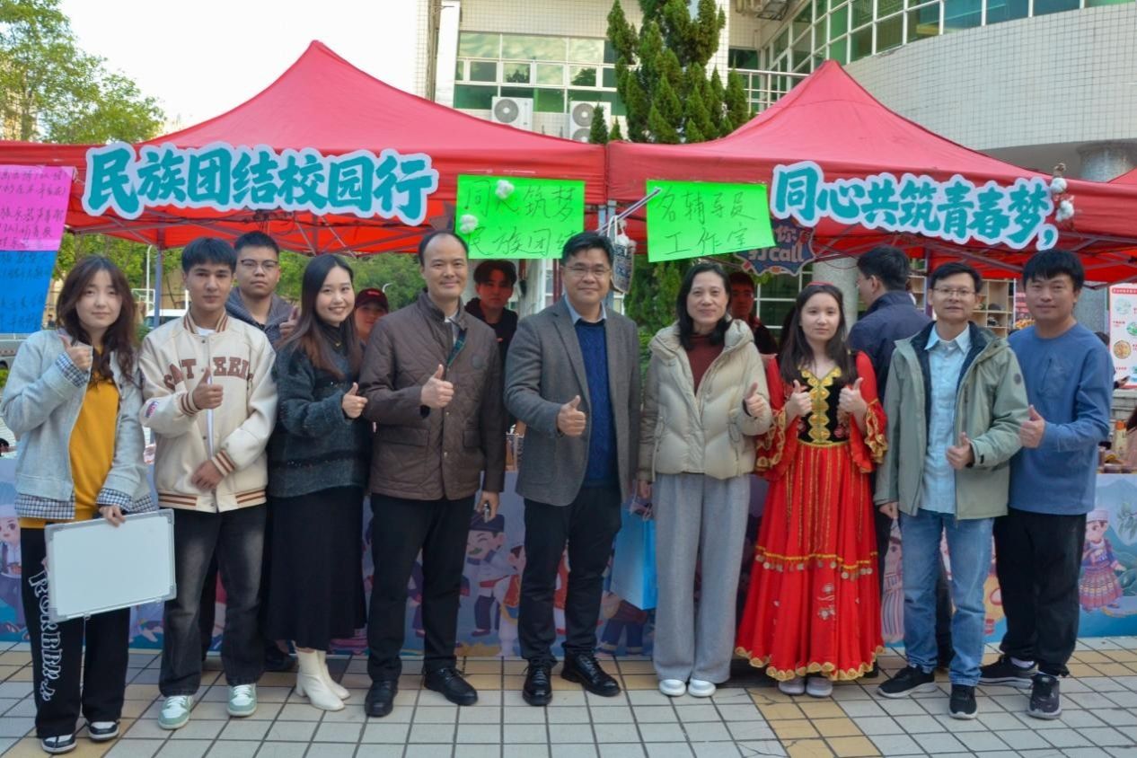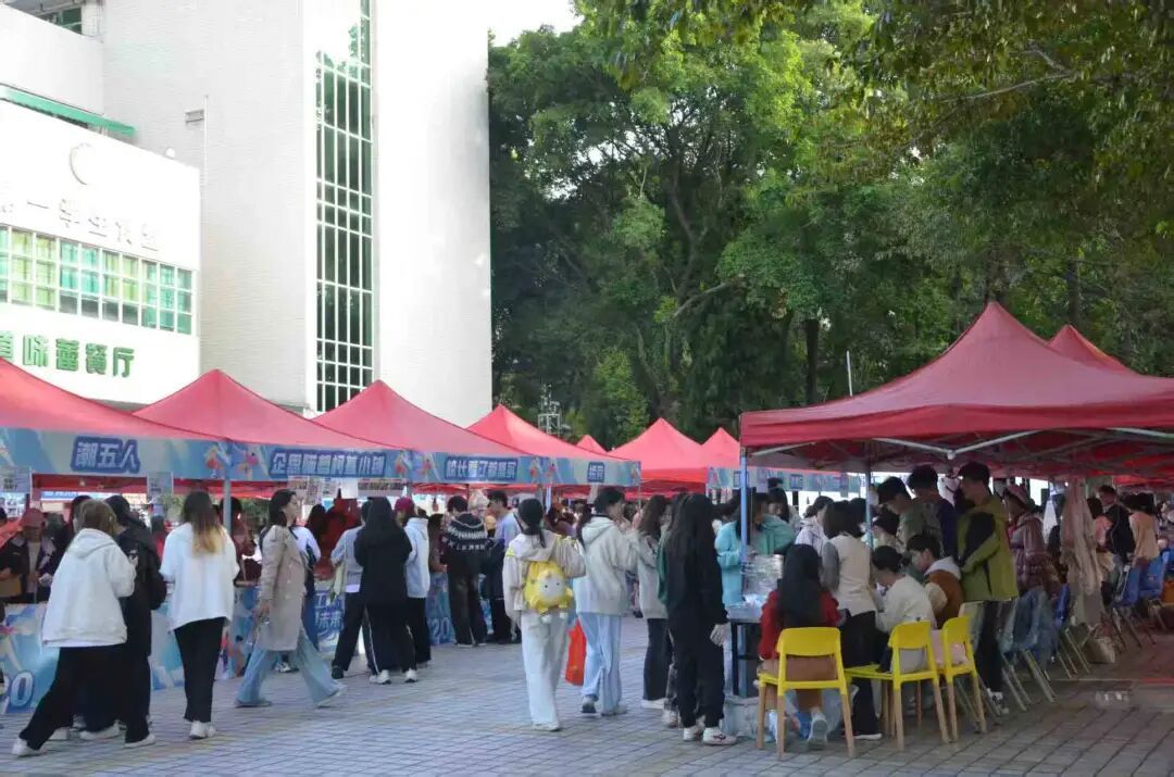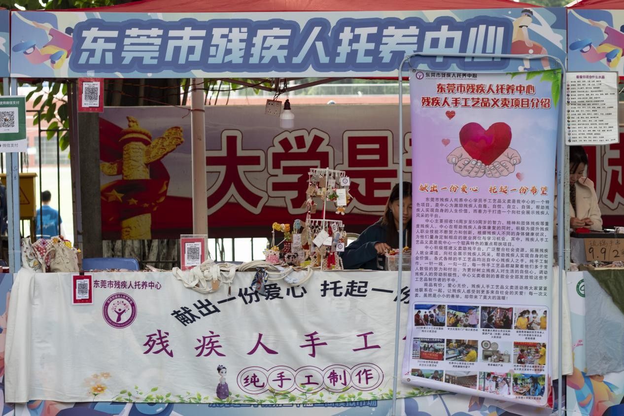 活动现场设立三大特色展区,构建实践育人与社会服务深度融合的立体格局,其中东莞市残疾人托养中心公益展位,展出学员们亲手制作的精美手工艺品吸引了众多师生驻足欣赏与交流,温馨互动构筑校园暖心图景;“百千万工程”助农专区,集中展销来自对口帮扶区的优质农副产品,师生踊跃认购,以切实的消费帮扶赋能乡村振兴;“同心筑梦 民族团结”展区,通过丰富多彩的民族特色文化展示与互动体验,促进不同民族师生间的理解与交融,搭建起民族团结的桥梁。