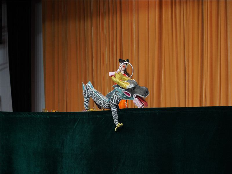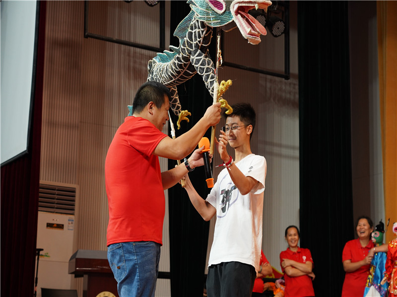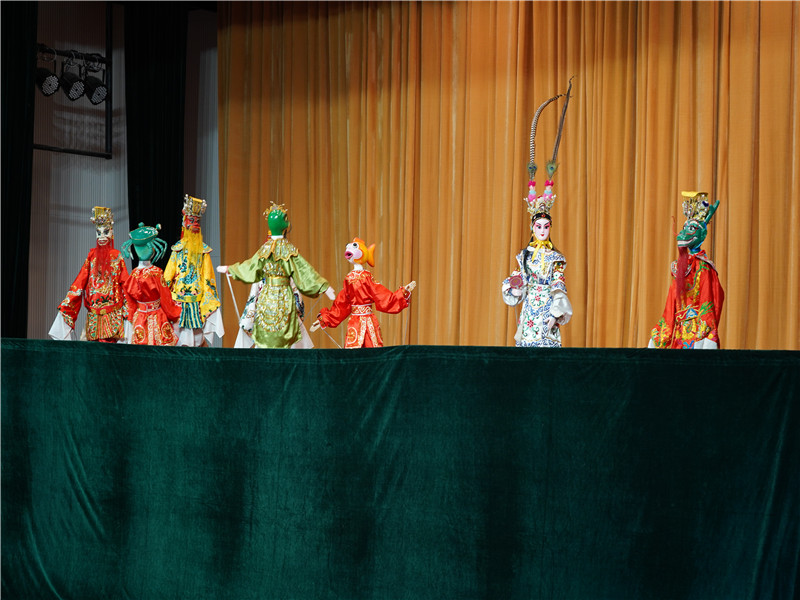 随后,大朗巷头木偶剧剧团为大家带来了传统木偶剧《悦城龙母》选段表演。“锵——锵——锵锵!”一阵响亮的锣鼓开场后,龙王、龙太子、龟丞相、虾兵等一一登场。传统的粤语唱腔、华丽的服饰、灵活的身姿一下子就吸引在场的观众。脍炙人口的《哪吒闹海》节奏明快、动作利落赢得同学们的阵阵掌声。