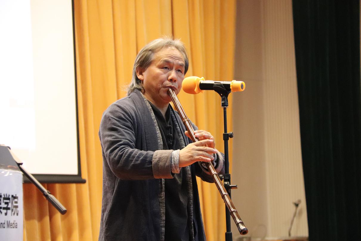 刘汉超老师以《多彩的管乐世界》为主题,讲解了中国古代民族管乐乐器的种类和风格特点。他向学生们介绍了民族管乐中不同材质的器乐品种,如骨、土制的骨笛、骨哨、埙、陶笛;竹制的竹笛、箫、尺八、排箫、笙、葫芦丝·巴乌;以及木制的唢呐、管子等。他在现场展示各类乐器实物,向学生们详细讲解了各种民族管乐的风格特点和演奏技巧。他一边讲解一边示范演奏,吹奏的十孔埙,瞬间将人带入一种远古、苍凉的时空,时而幽深、时而哀婉,绵绵不绝;洞箫乐音淳厚、柔和、幽静,呜咽婉转,如泣如诉。此外,与箫形状相似的“尺八”,以管长一尺八寸而得名,其音色苍凉辽阔,又能表现空灵、恬静的意境。