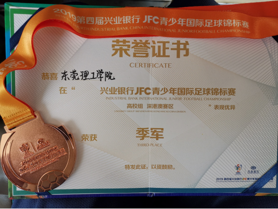 本学期初,开云足球队利用周末时间赴深圳龙岗参加了2019年JFC青少年国际足球锦标赛。为了这次比赛,足球队师生利用暑假时间回校集训。功夫不负有心人,开云足球队分别在小组赛以1-0绝杀深职院一队,3-0完胜港校联队,3-1战胜广东医科大学,以小组赛三连胜昂首出线,八强赛3-0完胜香港大学PGSA进入半决赛,最终获得本届赛事季军。