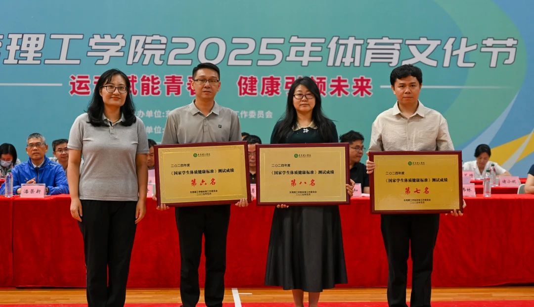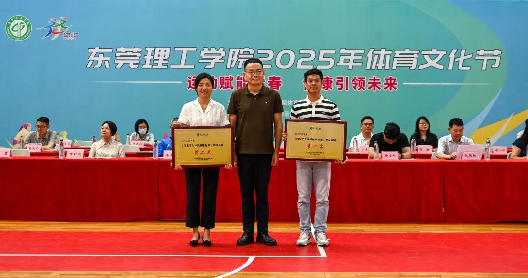 为鼓励莞工学子踊跃参与体育锻炼,开幕式上公布了2024年《国家学生体质健康标准》测试成绩,并为前8名学院颁发奖牌。