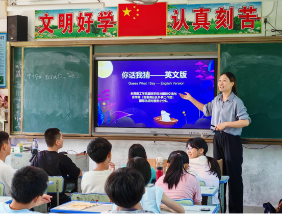 小学生们轮流上阵,用手势与简单英语描述单词。比划“兔子”时蹦跳竖耳,形容“月饼”时模拟圆月、做出品尝表情。留学生们则努力从动作与零星词汇中猜答案,每猜中一个,双方击掌欢呼,课堂秒变欢乐赛场。