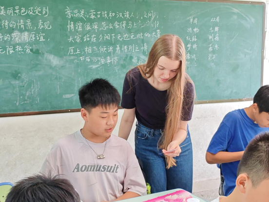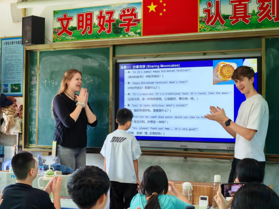 “How to say ‘月饼’、‘团圆’in your dialect?”德国留学生Rowena的本子上记满中国词汇;而六年级学生小陈在俄罗斯学生Daniil的鼓励下,第一次用英语完整地介绍自己。双向语言课堂打破隔阂,教室里笑声与朗读声此起彼伏。