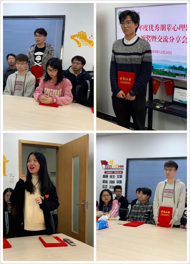 在交流分享中,获奖同学分享了在日常心理助人工作中的感受与体会。心理健康教育与咨询中心助理朱家豪谈到疫情期间线上咨询量增多,有时会感到忙碌及无助感,但在老师们的指导下,学会了与来访者沟通的技巧与方法,充实自己的同时感受到工作带来的意义。学生社团阳光心理协会会长陈俊儒分享到自己选择这份工作的时候,并没有想过奖励,今天得到老师们的表扬和肯定,十分珍贵,以后的工作定会保持心中的热爱与坚守,继续为同学们服务。社区心理发展中心助理吴双龙谈到在这个岗位,得到老师们非常多的帮助,自己办公能力及助人能力上都得到了提升,助人工作不仅服务了同学,使他们获得心理上的帮助,也解开了自己生活中的一些困扰。刘嘉瑜讲到看见同学因为得到心理的疏导与帮助而发生积极的改变,自己更加认可了心理健康教育工作的作用与意义。