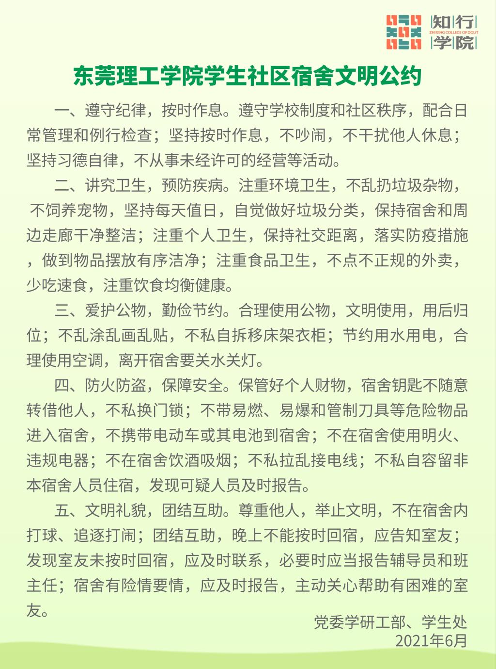为倡导学生在社区中形成良好的生活习惯,积极创建文明、和谐的宿舍人际关系,学生社区知行学院于6月16日至17日开展《学生社区宿舍文明公约》宣传活动,7个社区累计走访共计3742间宿舍。