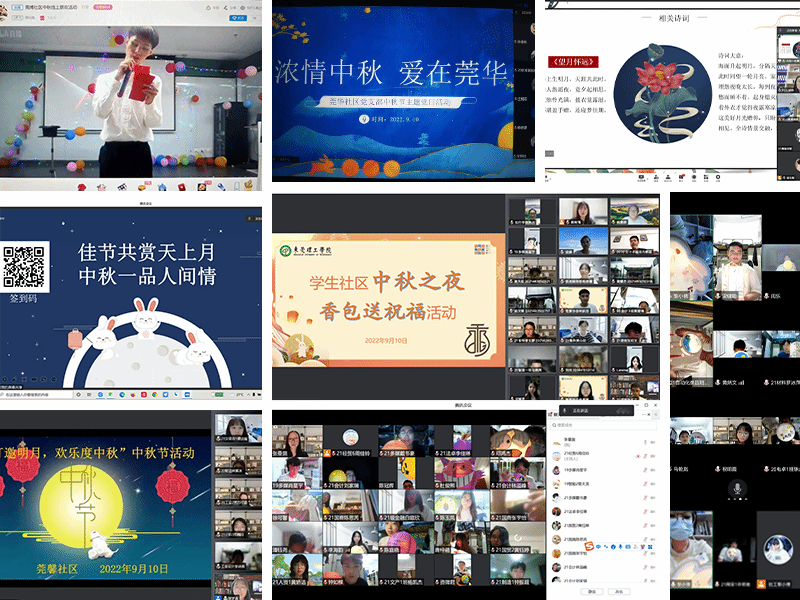 在分会场也就是各分院,结合了社区特色开展的各项活动也精彩纷呈,尽管多数是在线上,但同学们的热情丝毫不减。莞逸分院“中秋夜,点花灯”活动教同学们制作花灯,同学们学习之后都动起手尝试起来;莞博分院“中秋相聚,博采众长”举办线上联欢活动,有猜灯谜和才艺表演,这将线上过节气氛拉到了高潮;莞馨分院“花灯邀明月,欢度中秋”活动请同学们分享各自家乡的中秋习俗,大家都兴致盎然参与其中;莞雅分院“八月十五夜,莞雅共婵娟”活动和莞华分院“浓情中秋,爱在莞华”活动中,歌鉴赏和诗花灯制作都颇受同学们喜欢;莞思分院“佳节共赏天上月,中秋一品人间情”活动和莞和分院“月月人团圆,提灯赏中秋”活动还有线上猜谜和知识问答活动,相对应有丰富的奖励,同学们参与其中不亦乐乎。