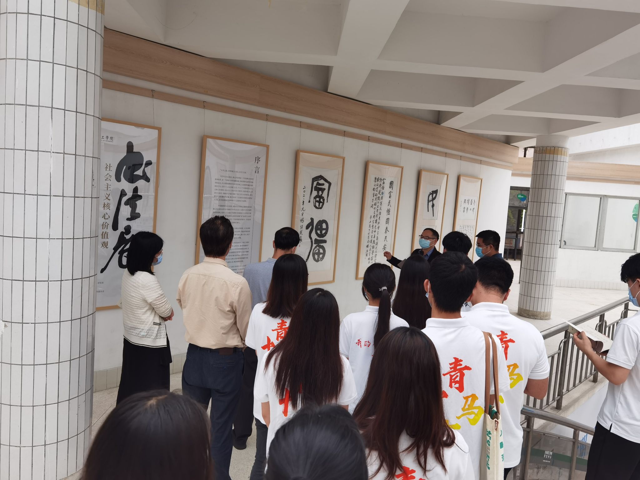 在参观过程中,杨继龙在讲解中指出,书法是我国的优秀传统文化之一,以社会主义核心价值观为主题的书法作品既展现了中华优秀传统文化的魅力,发挥文艺作品的教化作用,又弘扬了社会主义核心价值观,推动社会主义核心价值观深入人心,寻求的是搭建纯艺术与实用性之间的一个桥梁。针对同学们的问题,他也予以回答并且进一步引导和启发大家发现美、欣赏美。师生代表纷纷对杨继龙高超的艺术造诣和对作品精益求精的态度表示敬佩。