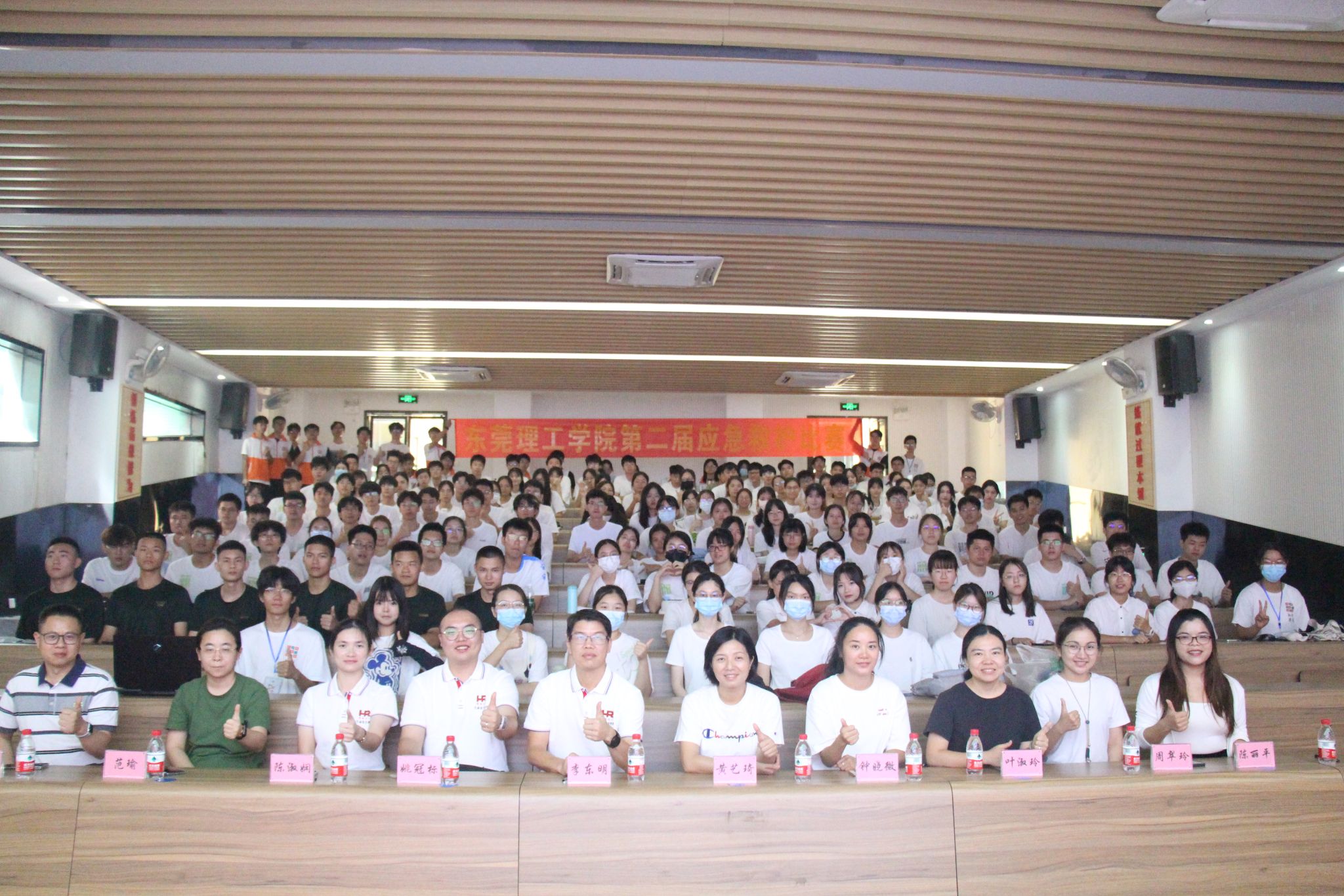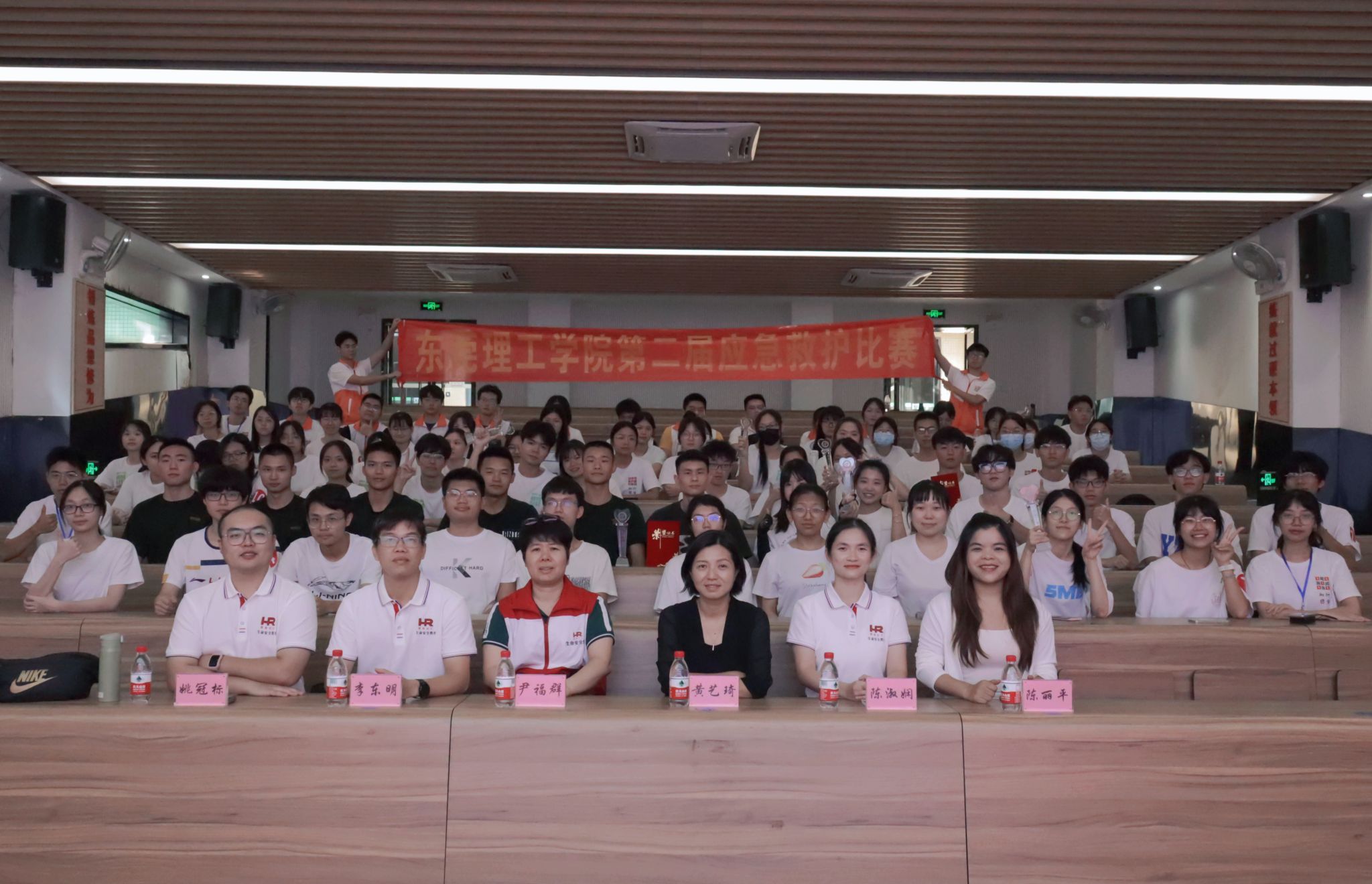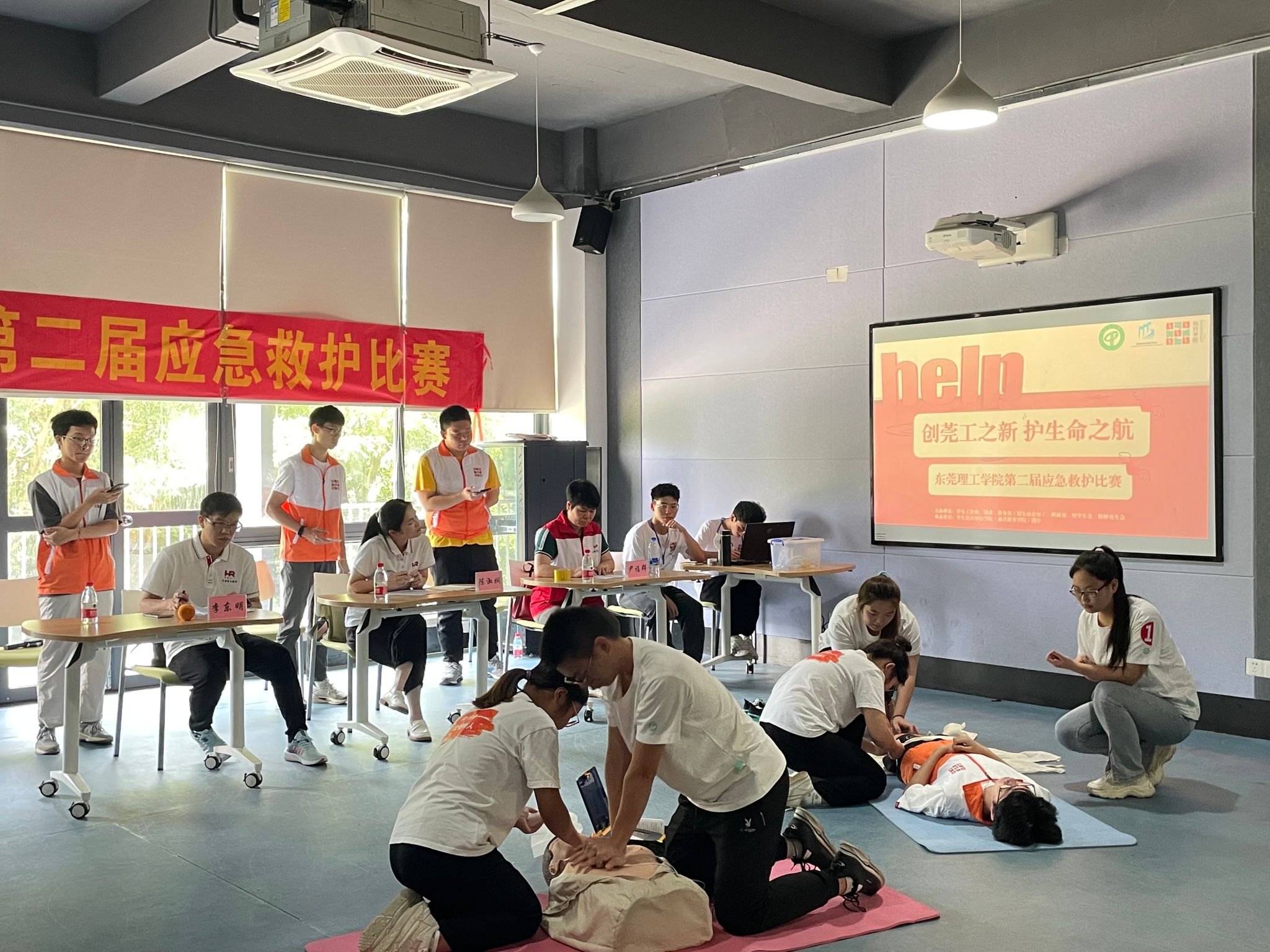 本次应急救护比赛分为初赛和决赛,参照东莞市赛标准,设置成人心肺复苏、左脚踝扭伤处理、右大腿闭合性骨折、右小腿烧烫伤处理等基本操作项目以及运动伤害现场救护场景、火灾事故现场救护场景等题目。