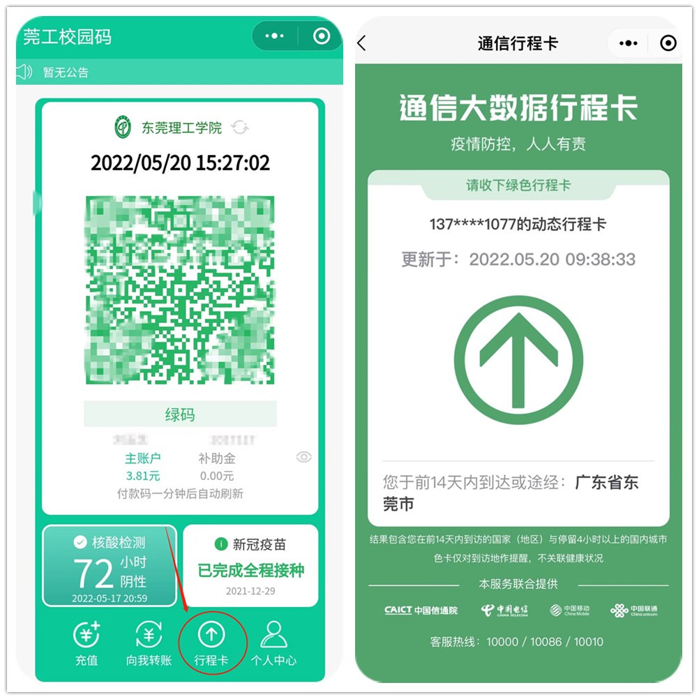 现在,莞工校园码界面又添了一枚新成员——行程卡。这是网信办、网络中心继今年2月份用技术手段实现莞工校园码与粤康码实时对接后实施的又一个信息惠民举措。