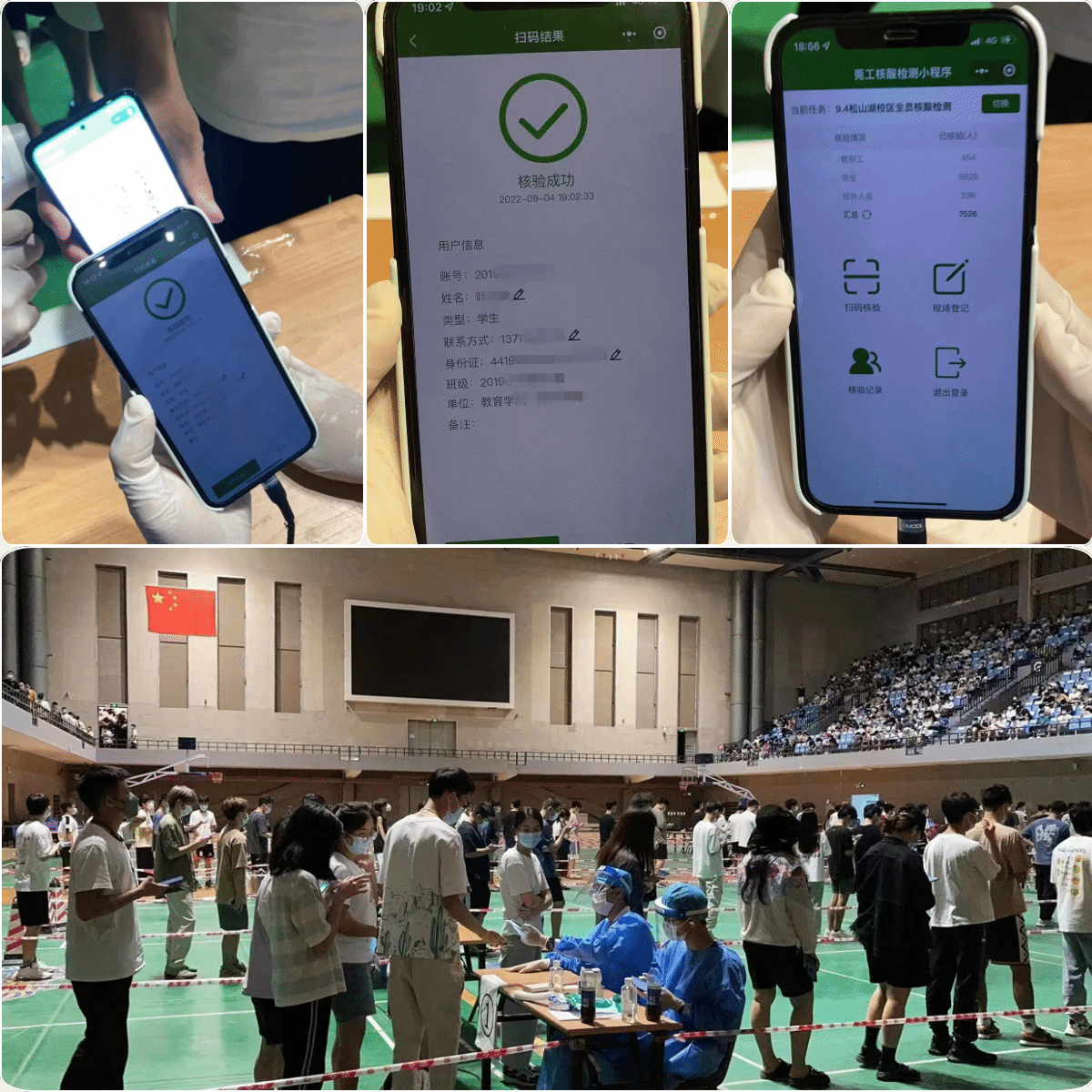 根据疫情防控要求,学校需不定期开展核酸检测工作。以往做核酸前,技术人员需要提前几个小时到场布网线、调设备,费时费力;采用“人工+自动”统计方式,难以保证不同类别人群核酸检测统计数据的精准性,不便于信息追踪和管理;校内师生、校外人员采样通道分流,容易站错队……而莞工核酸检测小程序上线后,拉网线、装POS机等前期准备步骤统统可以免除。小程序通过扫描莞工校园码或现场线上登记等方式,每人只需几秒就能在选定通道快速完成信息录入。核酸检测整个过程中,系统管理端通过分级赋权方便学校准确、动态、实时掌握师生核酸采样情况,同时支持对未采样人员发送实时短信提醒及时采样,全力确保“应检尽检、不漏一人”。核酸检测结束后,系统能够自动完成各二级组织机构的核酸检测数据分类统计,确保统计数据的精准及时。