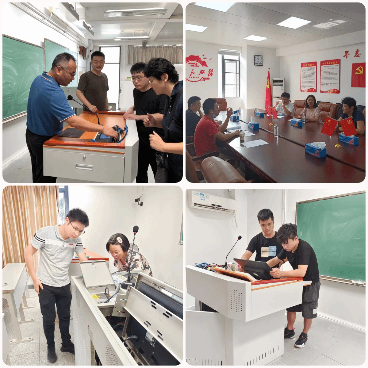 根据学校总体工作安排,在校党委的正确领导和有关二级组织机构的大力支持下,网信办、网络中心克服工期紧、任务重、多方衔接以及高温酷暑、外来人员疫情防控等诸多困难,经过暑假、教学周周末以及国庆假期紧锣密鼓地施工、反复地调试与测试等,完成对6、7号教学楼121间多媒体教室讲台的升级改造以及72间多媒体教室物联网中控的安装调试。