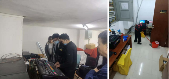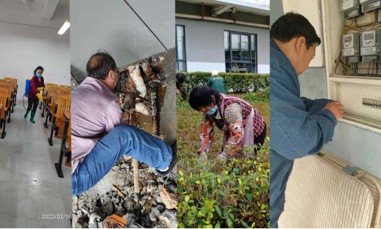 图为消杀教学楼、抢修管道、修剪绿植、检查电箱