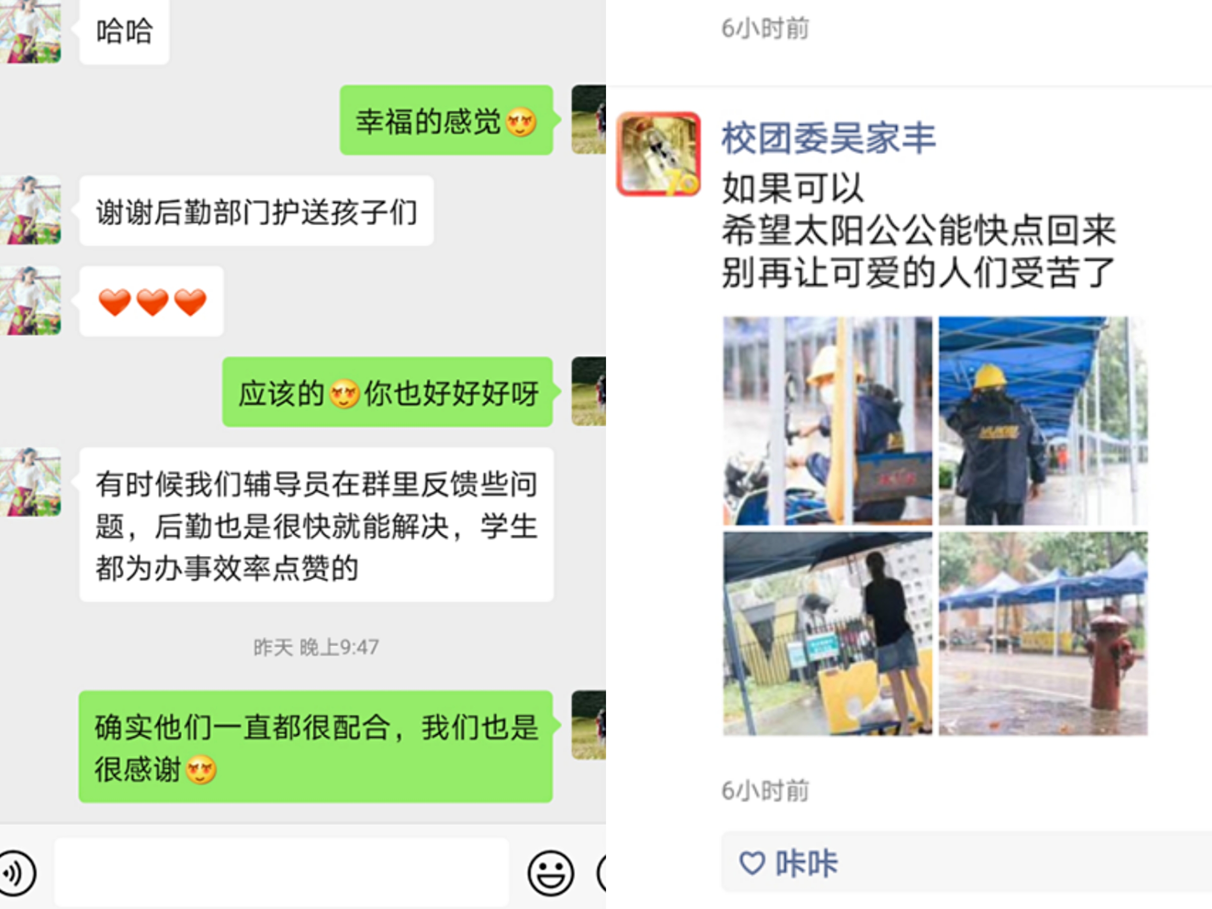 在毕业学生朋友圈中也不断涌现了他们对后勤工作者的感谢和肯定,发出“后勤滴滴,值得你拥有”、“为后勤滴滴打call”的感慨,表示后勤滴滴确实解决了同学们搬运行李的难题。在社区门口,“有事找后勤滴滴”成了他们毕业期间的共通语。