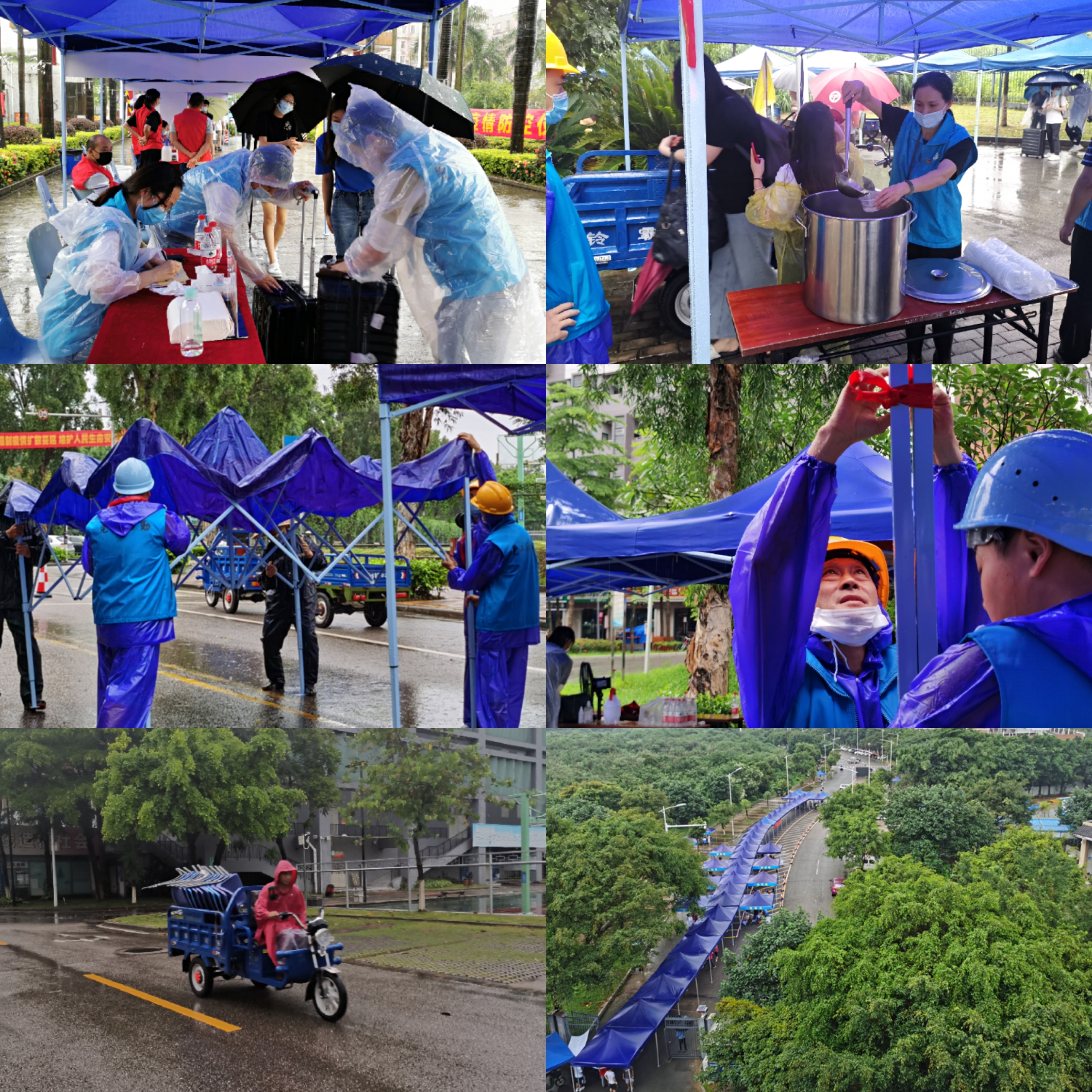 以学生返校为契机,后勤管理办完成了一系列保障工作,为学生顺利返校和离校保驾护航。6月7日,第三批学生返校当天,大风雷雨不断,为了不让学生及现场工作人员遭受雨淋,后勤工作人员迎难而上,没有退缩,早上六点便冒着大雨同心协力迅速搬运、搭建帐篷,形成紧密的遮雨通道;绿化工在雨中迅速清理大风雨折断的树枝,及时清理路障;环卫工在雨中清扫掉落的树叶和清理现场生活垃圾,冒着雨一车一车把垃圾运向校外垃圾场,保证校园的洁净美丽;食堂工作人员熬制热腾腾的姜糖水,在雨中为返校学生和现场工作人员送温暖;卫生所医务人员在帐篷下坚守岗位;后勤滴滴来回为返校离校学生搬运行李,在雨中,后勤人穿着最普通的雨衣,稍眯着双眼任由雨滴在脸上敲打把满载的行李送到终点。雨一直下,后勤人没有时间换上干爽的衣服,面对满地排放着的行李,要求主动加班,直至把最后一名学生行李运送至校外,此时已将近晚上九点了。据了解,担任后勤滴滴司机一职的绿化工们与所有水电工、环卫工一样,在早晨六点准时开始这一天工作。这一天有的后勤人一整天穿着湿漉漉的衣服,有的人多次淋湿换了四五次衣服。后勤直属党总支组织两个党支部开展党日志愿活动,充分发挥党员先锋模范带头作用,为学生提供后勤服务。