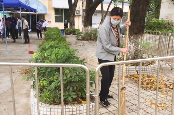“我们都是农村出来的人,是干活惯了的人,多干几个小时也不很累,学校就像家一样,校园干净,师生回来就安全,我们就开心。”石盛英是后勤管理办公室物业服务中心的一名环卫工,来莞工已有17个年头,每天清扫完份内的工作区,便和组长钟彩虹两人肩负起整个校园的室外垃圾桶、垃圾车的消毒工作。她们深知平日的疲惫,更懂得相互帮助,在休息空隙或下班后石盛英依然背着吹风机,骑着自行车在校园内进行2-4次巡查,“看到不干净的地方便过去清理,看到还没下班的同事,便下来帮忙,大家不那么累,心里就舒服。”正如她们说的,都是干活惯了的人,不会斤斤计较,“本来星期六是安排我们休息的,但我是负责消毒工作的,还是要去,我们看到脏的地方也要去扫。”