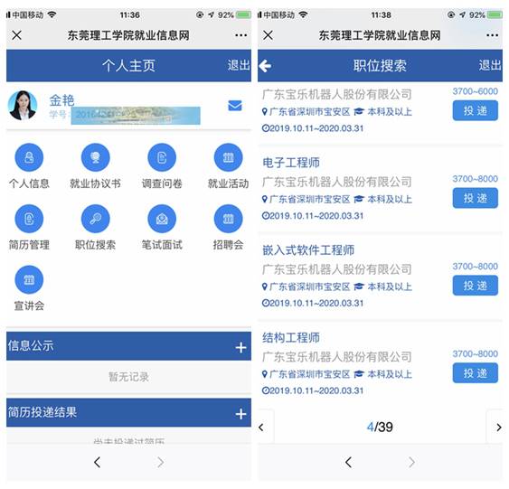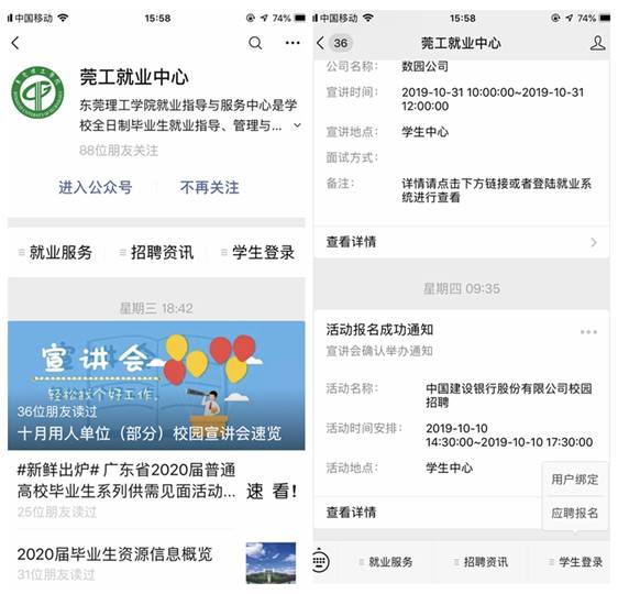 为让数据多跑路,学生少跑路,实现招聘信息精准推送到毕业生移动端,就业指导与服务中心经过对2019届毕业生电话调研回访,掌握同学们就业需求,进一步完善和优化“一网两微”(就业信息网、微信服务号、莞工就业小百科)平台。新学期伊始,经过反复测试,基本实现了用人单位进校所有招聘活动发布的招聘信息精准推送。同学们通过移动端,可即时准确获取相关专业就业信息,并通过系统预设的简历模板,一键发送简历,全线上完成招聘流程。