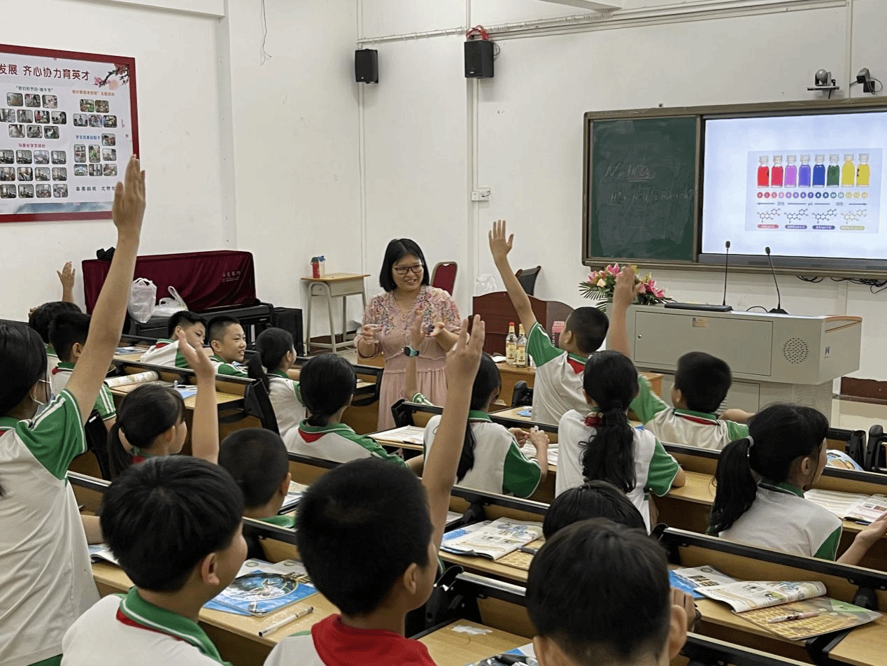 李翠丹以“紫薯变红薯的神奇体验”为主题,以生活中常见的水果为例,调动学生的积极性,引出自然界的天然色素-花青素。通过花青素分别与水、小苏打、紫甘蓝水、醋混合等一系列实践展示,以及指导学生们通过亲自实践,不仅了解到PH值知识,更收获了一份美好的课堂回忆。