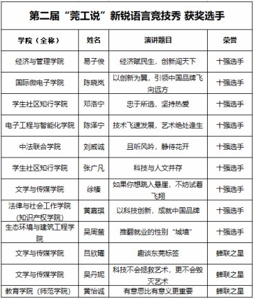 最终经过评委合议,经济与管理学院的易子俊、国际微电子学院的陈晓岚、电子工程与智能化学院的陈泽宁、生态环境与建筑工程学院吴周萤等9名同学荣获第二届“莞工说”9强荣誉。此外,首届十强荣誉获得者文传学院吕欣曜、吴丹妮,经管学院黄怡诚凭借在本届舞台上的出色表现,再次荣获蝉联之星荣誉。