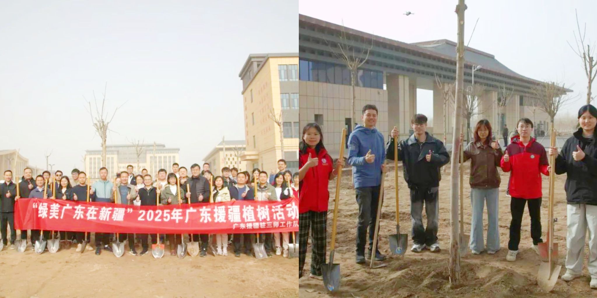 开云援疆实习支教团师生代表在图木舒克职业技术学院参与了2025年“绿美广东在新疆”植树活动,积极践行绿色发展理念,以实际行动推动绿色发展理念在新疆大地落地生根。