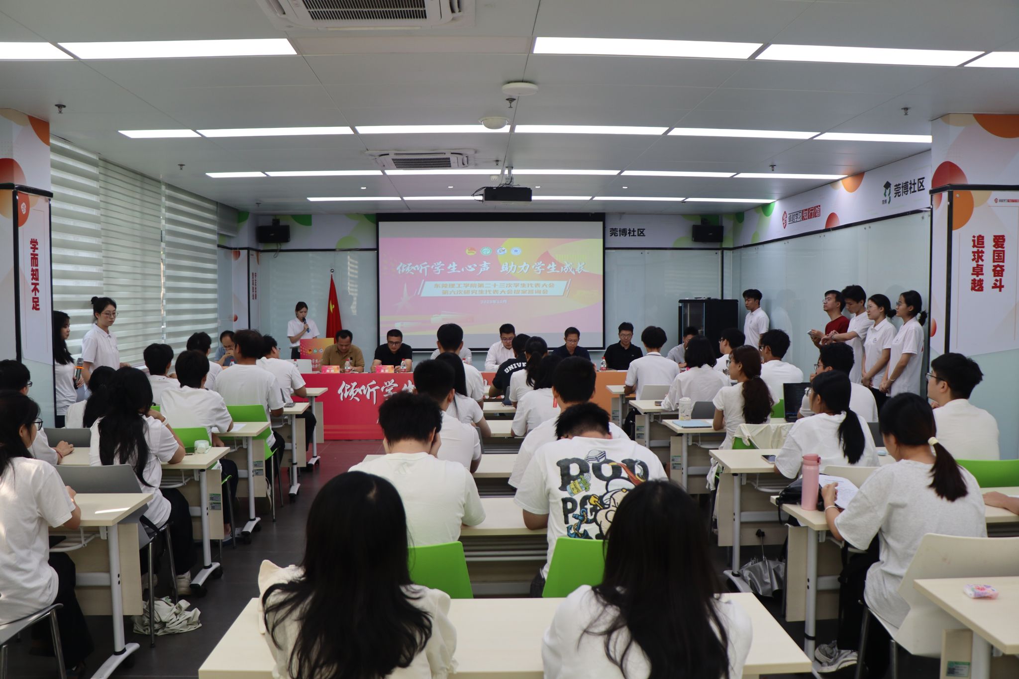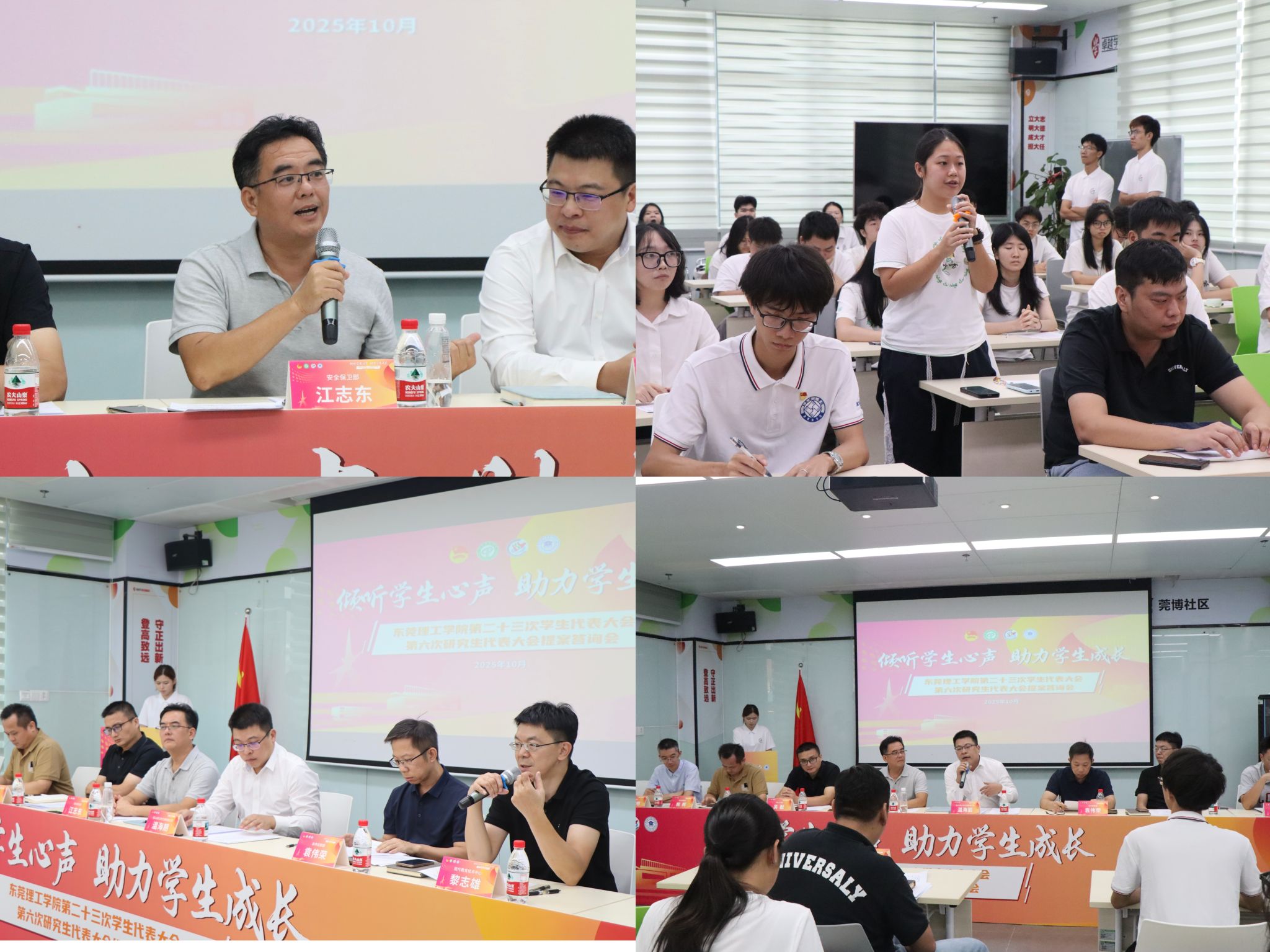 为深入贯彻落实“以学生为本”的办学理念,扎实推进“我为同学办实事”实践活动,10月16日下午,由校团委指导、校学生会与研究生会联合主办的开云kaiyun官方网站第二十三次学生代表大会、第六次研究生代表大会提案答询会在松山湖校区莞博社区活动室举行。本次会议旨在搭建校生直接对话的高效平台,将学生关切精准纳入学校“民生实事”工作序列。教务部、学生工作部、安全保卫部、总务后勤部、研究生院、现代教育技术中心、教育学院(师范学院)等单位相关负责人,松山湖公共交通有限公司代表,以及校院两级学生代表参会,共商校园发展大计。