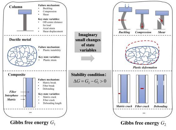 可靠地预测材料结构失效是各类工程结构最重要的关键问题。材料强度的传统理论主要依赖于经验公式。尽管文献中有多种强度理论可供参考,但它们的应用在很大程度上受到材料和工作条件的限制。为确保安全,工程结构的设计通常包含较大的安全系数,导致材料资源的大量使用。然而,这仍然无法消除灾难性事故的发生。最近,王彪教授建立了一种热力学框架以准确预测工程材料结构的失效强度,称为热力学强度理论(TST)。本文基于现代热力学建立了虚能量原理(PVE),以便在工程实际中应用。对于材料系统关键状态变量的给定微小虚变化,可以通过研究自由能的变化来建立加载材料结构的失效强度准则。本文通过一些实例展示了该原理的普遍性和可行性,这证明了其在所有工程应用中的良好前景。