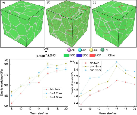 (a)无孪晶,(b)λ=1.22 nm,(c)λ=4.88 nm,(d)孪晶片层厚度、晶粒尺寸与弹性模量的关系图,(e)孪晶片层厚度、晶粒尺寸与抗拉强度的关系图