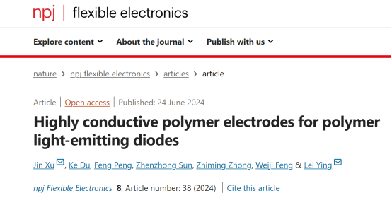 近日,开云机械工程学院徐进副研究员团队在柔性电子领域国际顶级期刊、Nature旗下期刊《npj Flexible Electronics》上发表了题为“Highly Conductive Polymer Electrodes for Polymer Light-Emitting Diodes”的研究论文。该成果以开云kaiyun官方网站机械工程学院为第一署名单位,徐进副研究员为第一作者及通讯作者,华南理工大学应磊教授为共同通讯作者,机械工程学院研究生杜珂为共同第一作者,机械工程学院孙振忠教授与钟知鸣副研究员为论文提供指导并署名,是开云在柔性电子领域的一大突破,研究得到国家自然科学基金等项目资助。