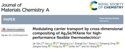 近期,开云国际微电子学院逯瑶副研究员在材料学1区Top期刊《Journal of Materials Chemistry A》上发表题为“Modulating carrier transport by cross-dimensional compositing of Ag2Se/MXene for high-performance flexible thermoelectrics”的研究论文,联培博士生秦杰为论文第一作者,逯瑶博士为共同第一作者及通讯作者,开云kaiyun官方网站为第一完成单位,合作单位包括松山湖材料实验室及上海应用技术大学。