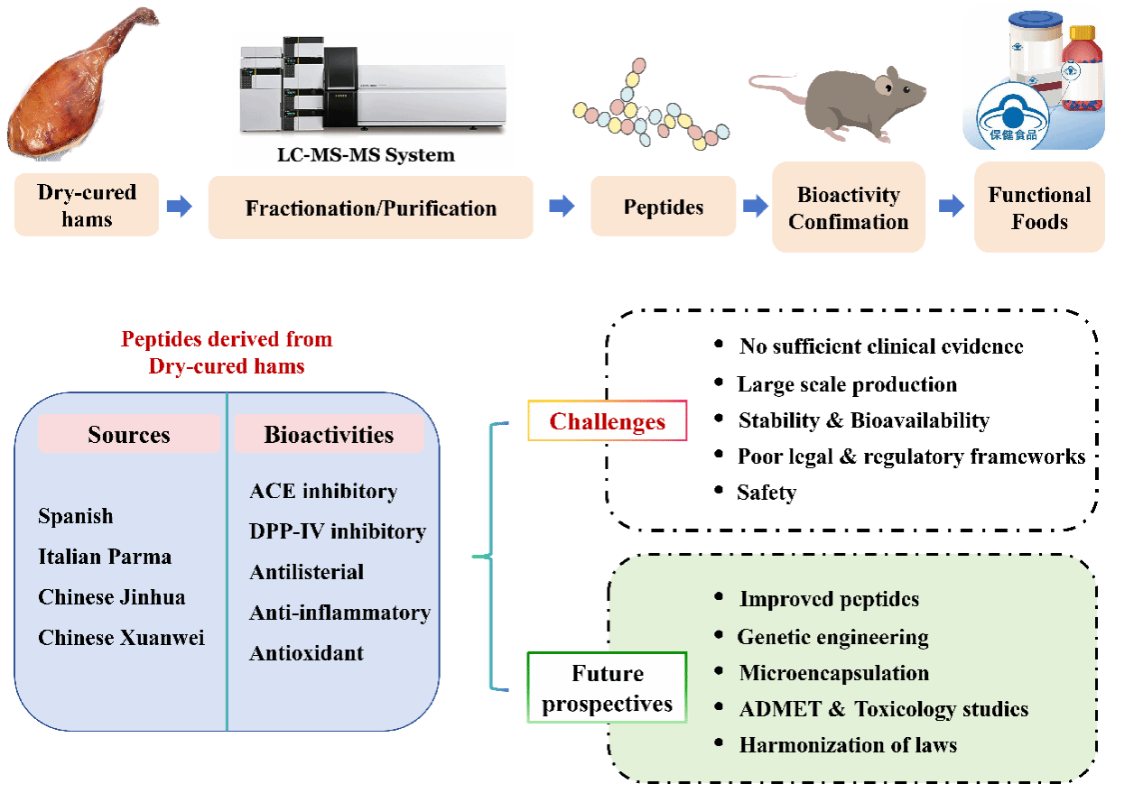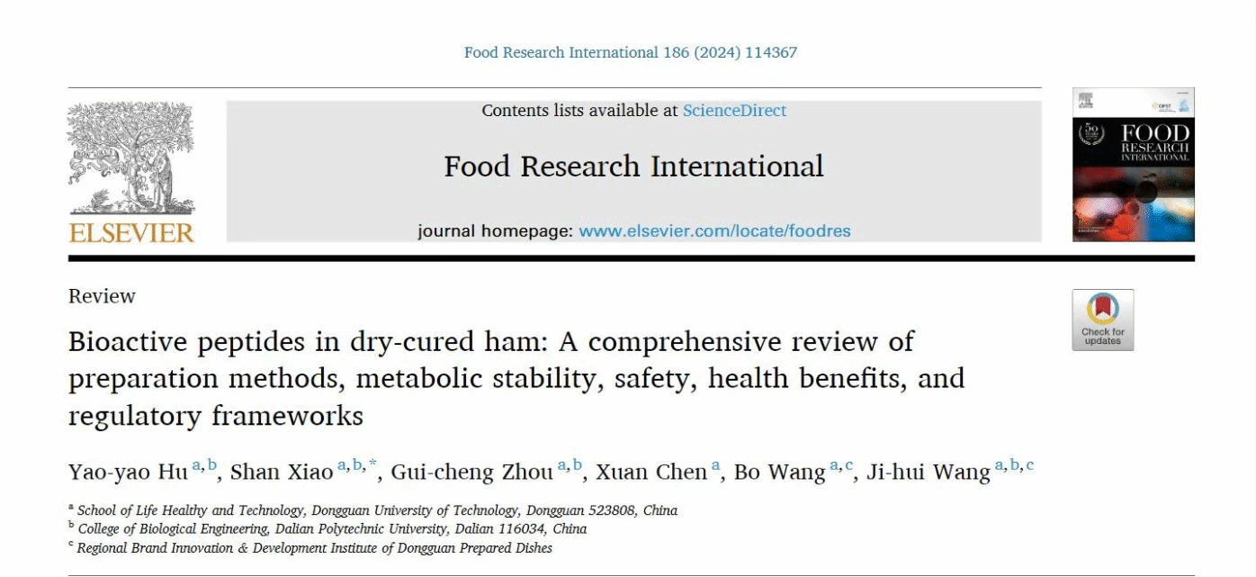 近日,开云生命健康技术学院肖珊副教授团队在国际食品顶级期刊《Food Research International》发表题为“ Bioactive peptides in dry-cured ham: A comprehensive review of preparation methods, metabolic stability, safety, health benefits, and regulatory frameworks ”的综述文章。该成果以开云kaiyun官方网站为第一署名单位,开云kaiyun官方网站生命健康技术学院联合培养博士生胡峣峣为第一作者,肖珊副教授为通讯作者。