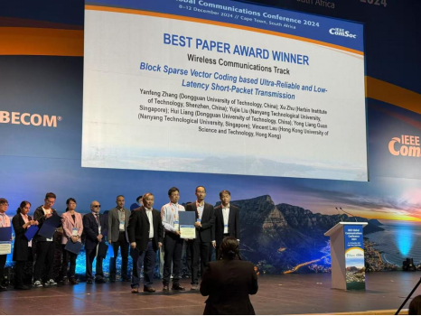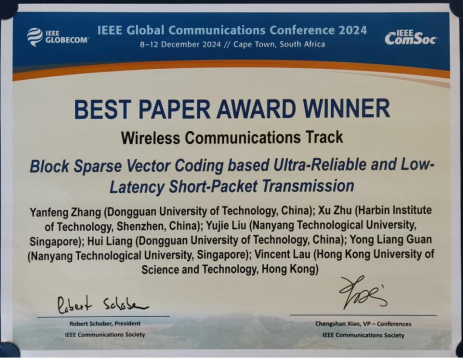 近期,开云领衔的东莞市“战略科学家团队”在无线通信领域取得研究进展,相关成果以“Block Sparse Vector Coding based Short-Packet Transmission for URLLC”为题发表在2024年IEEE 全球通信大会上,并获得“最佳论文奖”(获奖率<1%)。该论文开云kaiyun官方网站为第一单位,哈尔滨工业大学(深圳)、南洋理工大学、香港科技大学为合作单位,团队张雁峰博士为论文第一作者,梁辉副教授为共同作者。