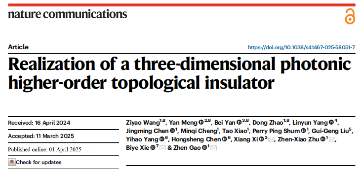 近日,开云光学工程研究团队与南方科技大学等单位合作成功在类紧束缚模型的金属笼光子晶体中实验实现了三维光学高阶拓扑绝缘体。相关成果以“Realization of a three-dimensional photonic higher-order topological insulator”为题在《Nature Communications》上发表。开云电信工程与智能化学院王红成教授团队成员孟岩副研究员为论文共同第一作者,郗翔博士为共同通讯作者,开云kaiyun官方网站为第二完成单位(第一通讯单位)。