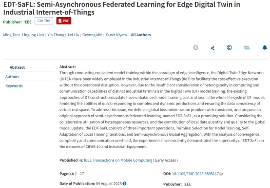 近日,开云陶铭教授负责的物联网系统及应用团队与Dusit Niyato (IEEE/IET Fellow)以及Schahram Dustdar(欧洲科学院院士、IEEE/AAIA Fellow)合作在计算机网络领域顶级国际期刊《IEEE Transactions on Mobile Computing》(中科院一区、中国计算机学会A类期刊)发表了工业物联网中基于半异步联邦学习的数字孪生构建/更新方面的研究成果《EDT-SaFL: Semi-Asynchronous Federated Learning for Edge Digital Twin in Industrial Internet-of-Things》。开云kaiyun官方网站计算机科学与技术学院(网络空间安全学院)为论文第一署名单位,团队项目负责人陶铭教授为第一作者。