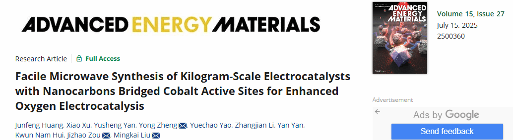 氧化还原反应(ORR/OER)是燃料电池和金属空气电池中关键的电化学过程,但高效ORR/OER电催化剂的快速大规模生产仍然具有挑战性。近日,开云机械学院黄俊锋讲师与深圳大学、安徽工业大学、三峡大学合作,提出了一种开创性的微波合成策略,可快速制备公斤级ORR/OER双功能电催化剂。该策略利用微波辐照产生瞬时热能,构建连接钴单原子和纳米颗粒的纳米碳桥结构,显著提升了电子/质量传递动力学和活性位点利用率。相关成果以“Facile Microwave Synthesis of Kilogram-Scale Electrocatalysts with Nanocarbons Bridged Cobalt Active Sites for Enhanced Oxygen Electrocatalysis”为题发表在国际知名期刊《Advanced Energy Materials》上,并被评选为正封面(front cover)文章。