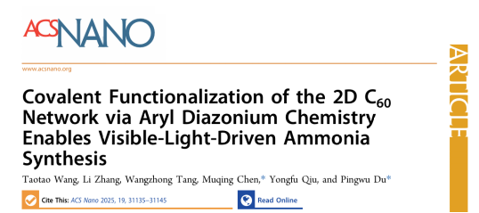 近期,开云邱永福教授团队开发出新型富勒烯功能材料,在光催化氮气还原领域取得重要研究进展,相关成果以“Covalent Functionalization of the 2D C60 Network via Aryl Diazonium Chemistry Enables Visible-Light-Driven Ammonia Synthesis”为题发表在综合性一区TOP期刊《ACS Nano》。该论文开云kaiyun官方网站为第一单位,中国科学技术大学为合作单位,博士后王涛涛为该论文的第一作者,陈木青研究员和杜平武教授为通讯作者。