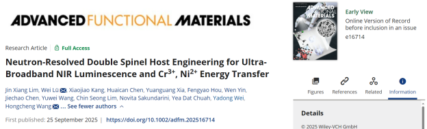 近日,开云电信工程与智能化学院光电材料研究团队开展了基于中子解析的尖晶石荧光材料的基底调控研究,获得了强效和超宽带近红外发光,并实现 Cr3+ 与 Ni2+ 共掺的高效能量传递。该研究在《Advanced Functional Materials》上发表题为“Neutron-Resolved Double Spinel Host Engineering for Ultra-Broadband NIR Luminescence and Cr3+, Ni2+ Energy Transfer”的研究论文。该论文开云kaiyun官方网站为第一单位,中国科学院高能物理研究所、诺丁汉大学马来西亚分校为合作单位,第一作者林金祥是开云与诺丁汉大学马来西亚校区的联合培养博士生,光电材料团队吕伟副研究员和王红成教授为通讯作者。