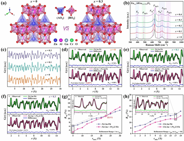 近红外光在夜视、生物成像、监测和检测等新领域具有广泛应用。宽带 Cr3+ 和 Ni2+ 激活的尖晶石荧光材料因其在近红外 (NIR) 应用中的潜力而受到广泛关注。然而,短程无序结构在调控其光致发光性能中的作用仍未得到充分探索。本文设计并制备了一系列 Cr3+ 和 Ni2+ 掺杂的 Zn1-xAlGa1+x*2/3O4 (x = 0–0.4) 近红外荧光材料。这一新颖的锌缺位基底优化策略系统性地调控反尖晶石系数 (阳离子反位) 与局域结构无序。本研究借助中国散裂中子源 (CSNS) 多物理谱仪 (MPI) 的中子散射与对分布函数分析,首次展示了多尺度结构–发光性能关系的中子学科视角。多尺度表征结果揭示,锌缺位促进了由反位驱动的短程阳离子有序,导致局域对称性破缺与配位点畸变,揭示了局域阳离子无序与近红外发光之间的联系。具体而言,优化组分表现出显著的短程四方阳离子有序 (P4122空间群对称),与长程有序的Fd-3m尖晶石骨架共存。这种结构的二元性凸显了多长度尺度手段在解析复杂尖晶石氧化物中细微相共存的重要性。单掺体系的发光得到显著增强,其中 Cr3+ 的发射带宽从 80 nm拓展至 257 nm,且外量子效率提升至 50.1%。同时,Ni2+ 的发射强度也因锌缺位引发的局域对称性破缺与晶格畸变而增强了四倍。进一步地,在最优晶体组分Zn0.7AlGa1.20O4 中引入 Cr3+、Ni2+ 共掺,近红外发射范围拓展至 650–1600 nm,并显著提升了 Ni2+ 发射的外量子效率,从 3.6% 提高至 46.9% (13倍)。本研究不仅展示了非常规基底调控工程对近红外发光性能的深远影响,还确立了中子散射作为探究发光机制的战略性工具,同时凸显了高效Zn0.7AlGa1.20O4:Cr3+, Ni2+ 共掺荧光材料的多功能性,包括荧光转换发光二极管为有效近红外光源和其应用、光学测温以及近红外光谱学。