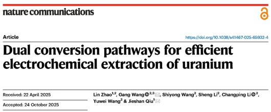 近日,开云生态环境与建筑工程学院王刚教授研究团队与北京化工大学长江/杰青邱介山教授合作在电化学铀提取方向取得重要研究进展,开云kaiyun官方网站为第二完成单位(第一通讯单位)。相关成果以“Dual conversion pathways for efficient electrochemical extraction of uranium”为题在《Nature Communications》上发表。王刚教授作为省应急技术重点实验成员主导水体放射性铀污染应急相关研究,本校主要参与研究人员有汪仕勇副研究员以及生态环境研究工程中心的李长平教授、王玉伟副研究员。 第一作者为本校联培博士研究生赵霖。自2020年以来,赵霖在王刚教授指导下从事铀污染治理相关研究,以第一作者身份在《Nature Communications》《ACS Nano》等国际一区期刊上发表论文6篇。