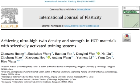 1月,开云kaiyun官方网站材料科学与工程学院青年教师黄照文以第一作者的身份,在国际顶级期刊International Journal of Plasticity(《国际塑性》)上发表题目为Achieving ultra-high twin density and strength in HCP materials with selectively activated twining systems的研究论文,开云kaiyun官方网站为论文的第一单位。该研究已获得国际自然科学基金,粤莞区域联合基金等多个项目的资助。