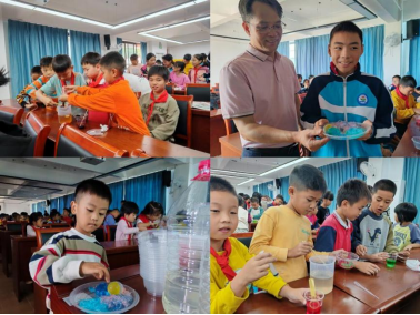 在趣味化学实验中,老师们为学生们带来的是“海藻酸钠水凝胶的制备”实验。实验指导老师用道具吸取了一定量用食用色素调色后的海藻酸钠溶液,注射到氯化钙溶液中。不久,彩色“面条”就成型了,同学们不禁发出“哇”的惊叹声,纷纷举手发表看法,表现出浓厚的兴趣和跃跃欲试的激情,课堂上充满了欢声笑语和惊讶的呼声。实践出真知,在老师的细心引导下,同学们亲自动手操作,体验趣味实验。他们尝试了化学溶解操作,变身化学魔法师,制备了QQ弹弹的水精灵、“水晶鸡蛋”和化学“面条”。一碗碗色彩缤纷、形态多样的“面条”再搭配上亲手制备的“鸡蛋”,与孩子们灿烂的笑容相映成趣,科普课堂瞬间成了欢乐的海洋,一场别开生面的活动在兴奋与愉悦的氛围中落下帷幕。