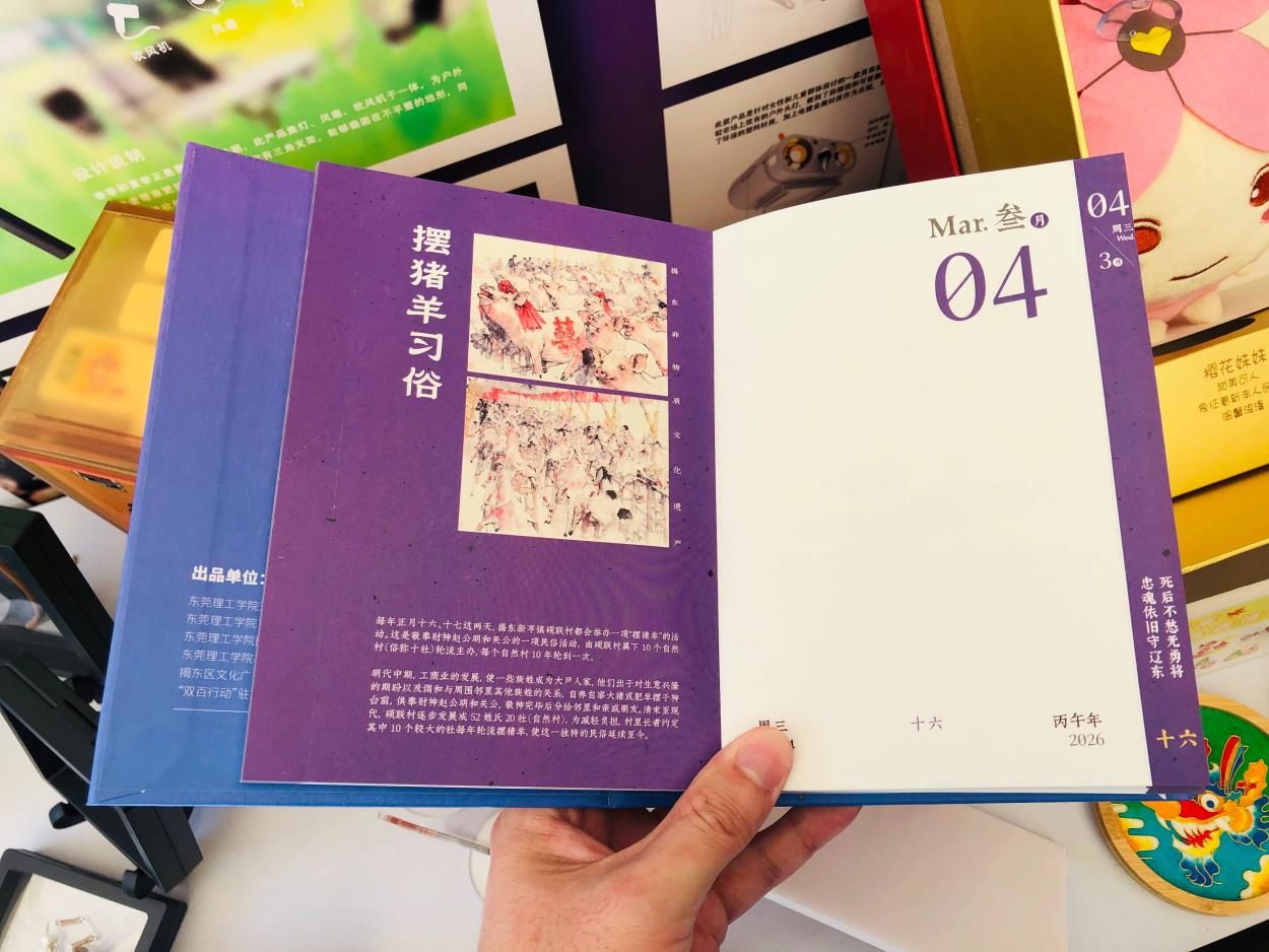 内容方面,手摺以揭东地区丰富的非物质文化遗产为创作内核,通过现代设计语言进行视觉转化与叙事重构。手摺中融入了揭阳龙舞(乔林烟花火龙)、玉雕(阳美翡翠玉雕)、灯杆彩凤习俗等元素,以日历的形式,层层展开非遗故事,让读者在翻阅中感受传统工艺与当代美学的对话。