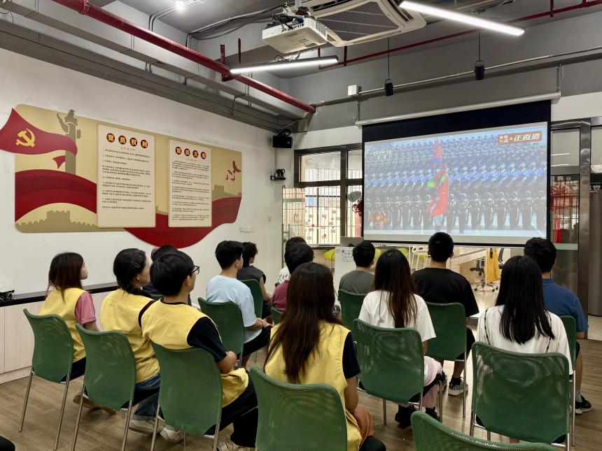9月3日上午,学生社区知行学院(通识教育学院)充分发挥“一站式”学生社区阵地优势,积极组织在校学生在莞馨、莞逸、莞博和莞思等社区活动室内集中观看阅兵盛况。